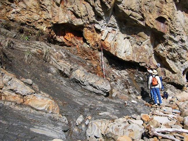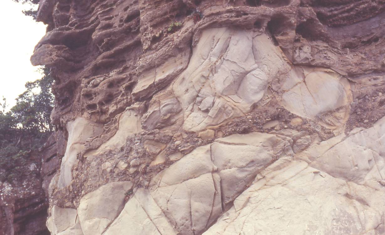 この付近の基底礫岩には、海底地すべりで生じたイベント的な堆積物基底の角礫岩層(sole breccia)が存在する。