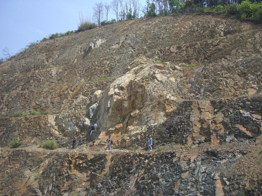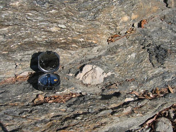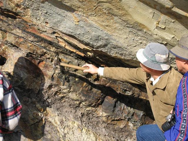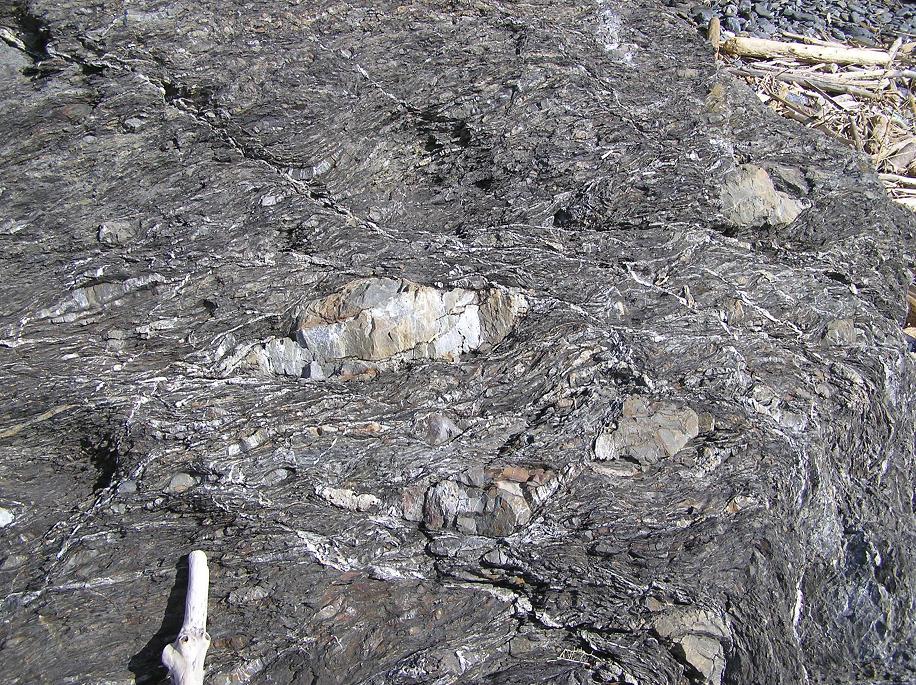 写真は典型的なせん断泥質岩で、ちりめん皺状の石英脈と湾曲した劈開面が発達している。