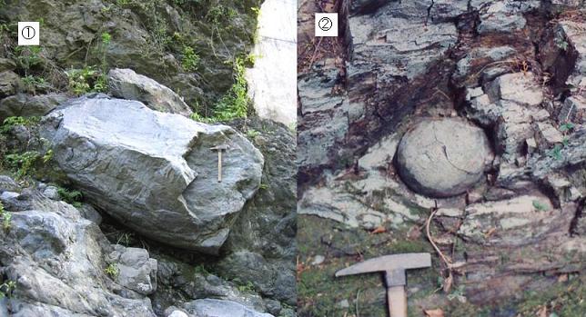 ②の砂岩は、周辺の頁岩の単純せん断変形に引きずられて回転を起こしボール状(δ構造)になっている。