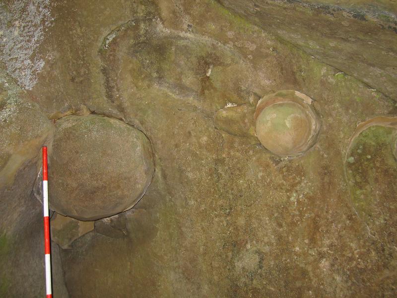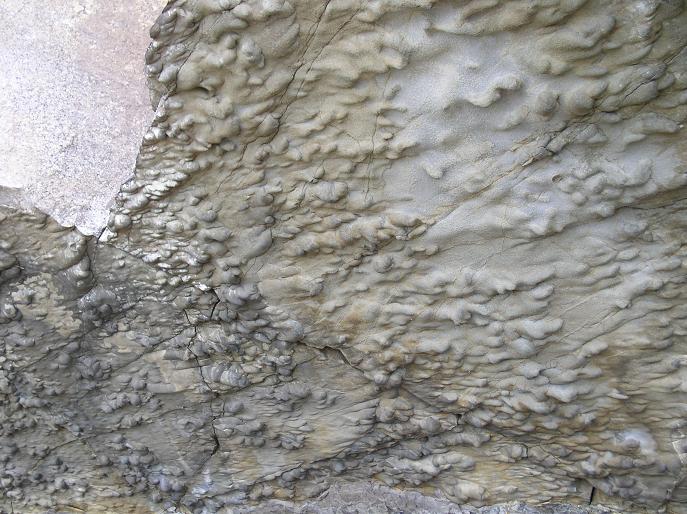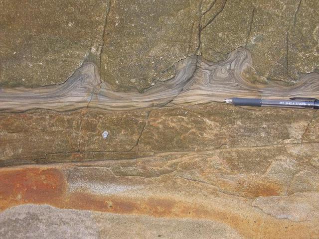 荷重痕(load cast)・・・密度の大きい砂層(礫層)が密度の小さい泥層の上にあって、未固結状態であると、その境界線は密度の逆転によって重力的に不安定である。
