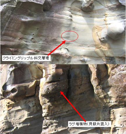 宮崎県南部の油津湾沿岸に分布する、宮崎層群基底部の砂岩にはハンモック状斜交層理が発達している。