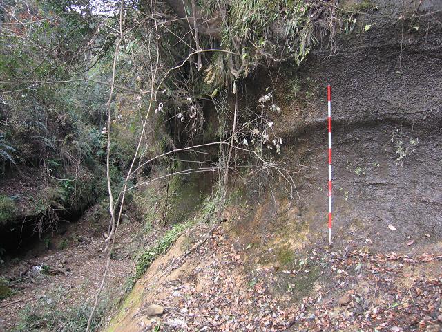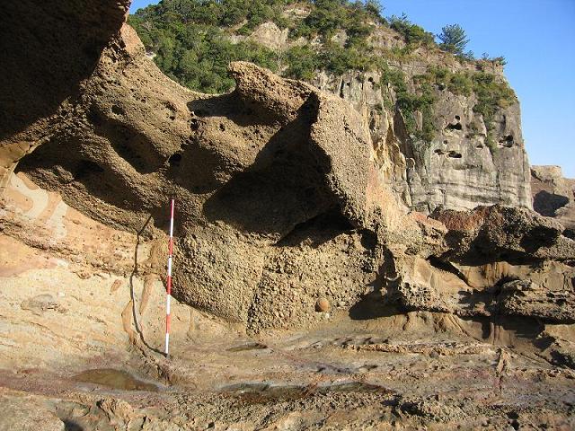 不整合面の下位は日南層群の頁岩や砂岩(海成層;新生代古第三紀)、上位は宮崎層群の礫岩や砂岩(陸成層:新生代新第三紀)。