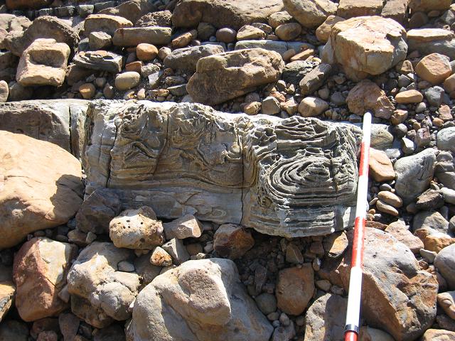 写真中央の砂岩も回転しており、両翼の波状砂岩片は、回転時に歪みが小さかったところ(pressure shadow)と考えられる。