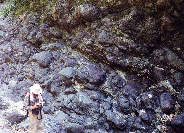 神門層のせん断泥質岩は、ちぎられた砂岩を頻繁に挟むせん断泥質岩から成り、ちりめん皺状の石英脈と湾曲した劈開面が発達している。