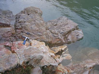 砂岩層の方向は地層の走向と一致するが、水面が存在すると走向がより明瞭になり、クリノメータで正確に測定できる。
