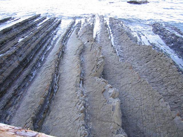 このため、地層が傾いていると海食台(海食作用によって形成された 基盤岩でできた平滑な地形)で差別浸食がおこり、波状の凹凸が形成される。