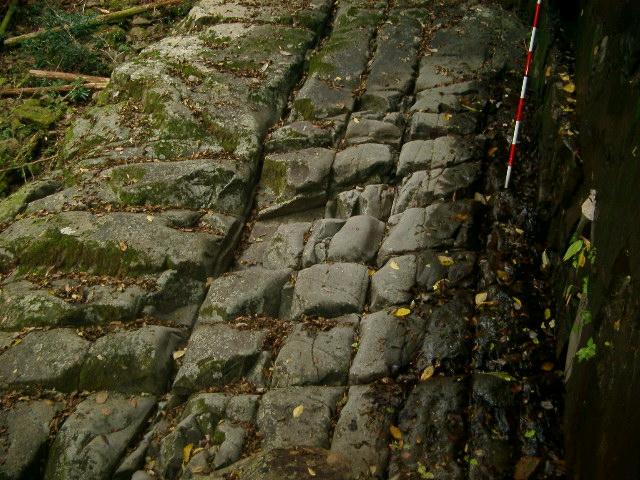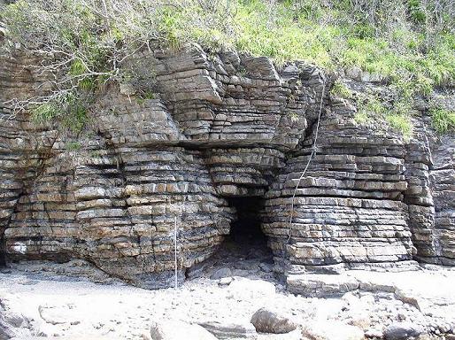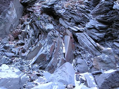 板を積んだような節理、この安山岩にはオリビンが含有されている。