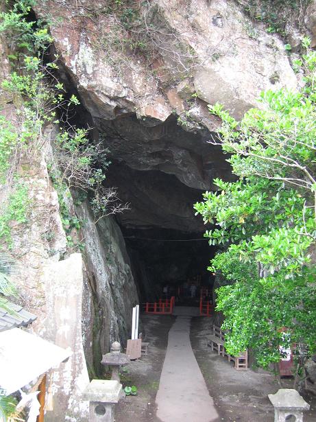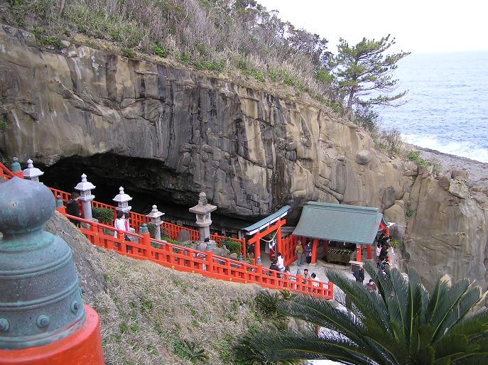 宮崎層群の厚い砂岩を穿った海食洞と、洞内につくられた社殿