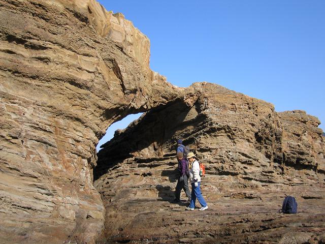写真の海食洞(sea cave)は、左側にある節理と同じ方向であるので、節理に沿って形成されたと考えられる。