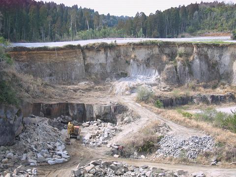 下位より凝灰岩の採石場、シラス、テフラの堆積状態が見える