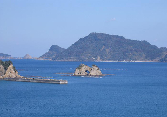 馬ヶ背を海側から見た、珍しい写真。三本の節理が南北方向(写真上では 上下)に入っているのが解る。